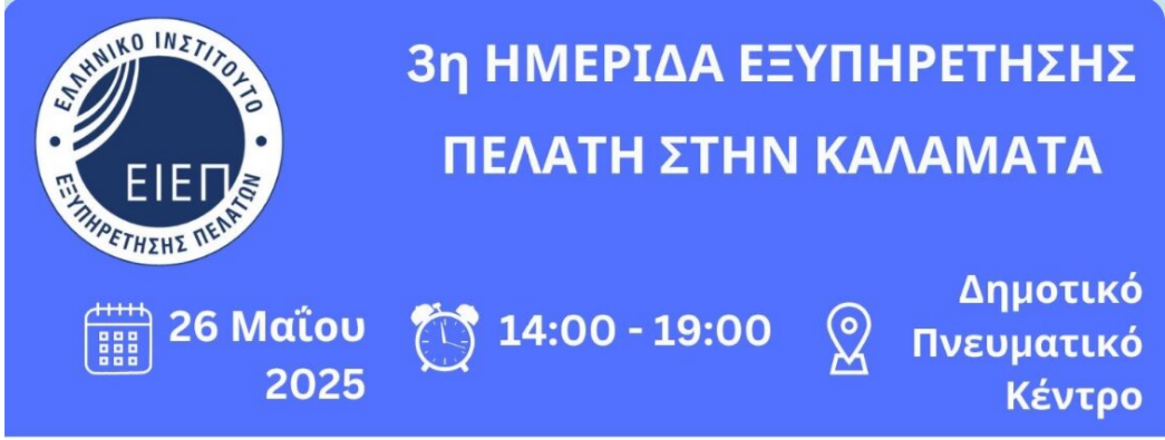 Το Ελληνικό Ινστιτούτο Εξυπηρέτησης Πελατών (ΕΙΕΠ), στο πλαίσιο της αποστολής του για την ενίσχυση της κουλτούρας εξυπηρέτησης στην Ελλάδα, διοργανώνει για τρίτη συνεχόμενη χρονιά την Ημερίδα Εξυπηρέτησης Πελάτη στην Καλαμάτα, τη Δευτέρα 26 Μαΐου 2025, στο Πνευματικό Κέντρο Καλαμάτας.