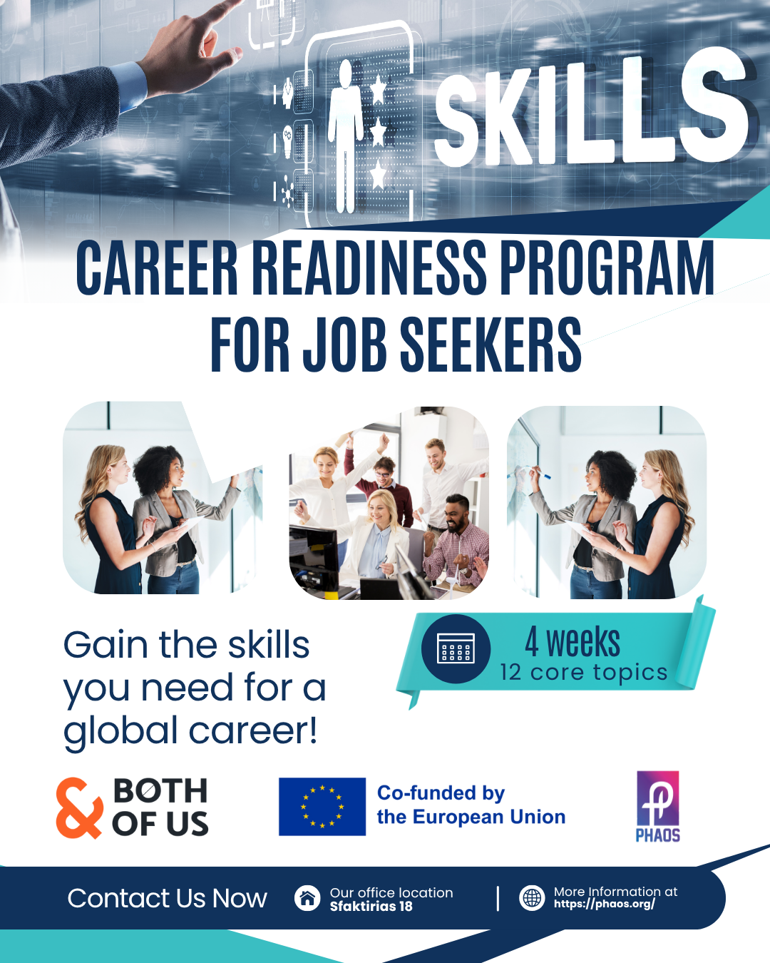 Η Κοιν.Σ.Επ. «Φάος», σε συνεργασία με τον Οργανισμό “Both of Us”, ανακοινώνει την έναρξη του “Job, Skills & Career Readiness Program”, ενός ολοκληρωμένου προγράμματος ανάπτυξης δεξιοτήτων και επαγγελματικής προετοιμασίας, που ξεκινά τη Δευτέρα 20 Οκτωβρίου 2025.