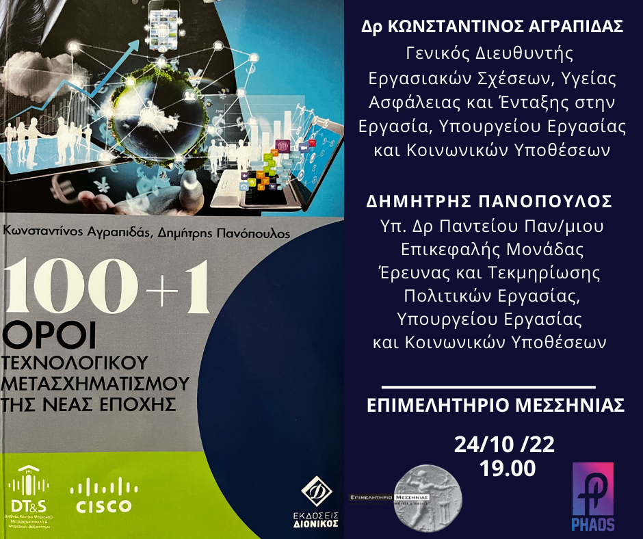 Με αφορμή τις συνεχείς αλλαγές που πραγματοποιούνται στον εκσυγχρονισμό των επιχειρήσεων και τον ψηφιακό αναλφαβητισμό που διακρίνει πληθώρα επιχειρηματιών, το Επιμελητήριο Μεσσηνίας και η “Φάος” ΚοινΣΕπ στο πλαίσιο των δραστηριοτήτων της και ως μέλος του Εθνικού Δικτύου Κοινωνικής Καινοτομίας, σας προσκαλούν την Δευτέρα 24 Οκτωβρίου 2022 και ώρα 19.00 στην αίθουσα συνεδριάσεων του του Επιμελητηρίου, για την παρουσίαση του Λεξικού «100 + 1 Όροι Τεχνολογικού Μετασχηματισμού της Νέας Εποχής».Το εν λόγω πόνημα, αποτελεί μια πρώτη συστηματική και μεθοδική προσπάθεια συλλογής, καταγραφής και ερμηνείας όλων των ορολογικών προσδιορισμών και εννοιών που σχετίζονται με την διείσδυση της τεχνολογίας στην αγορά εργασίας την οικονομία και την κοινωνία. Η μετάβαση στην ψηφιακή εποχή, της τεχνητής νοημοσύνης της μηχανικής εκμάθησης, της ρομποτικής των μεγάλων δεδομένων και της βιοτεχνολογίας, συνιστά μια διαρκή κοινωνική αλλαγή που επηρεάζει τη λειτουργία της οικονομίας, των επιχειρήσεων, τη φύση και την έννοια της εργασίας, την αγορά εργασίας και τις επιστήμες. Η κατανόηση των βασικών εννοιών και ορισμών, αποτελεί ένα πρώτο βασικό βήμα για την προσαρμογή στο νέο περιβάλλον που δημιουργείται με καταιγιστικούς ρυθμούς σε παγκόσμιο επίπεδο και επηρεάζει οριζόντια όλες τις ανθρώπινες δραστηριότητες. Ήδη η προσέγγιση στην “έξυπνη κοινωνία 5.0” αντανακλά στην κοινωνική διάσταση του ψηφιακού μετασχηματισμού σε όρους κοινωνικής ευημερίας.