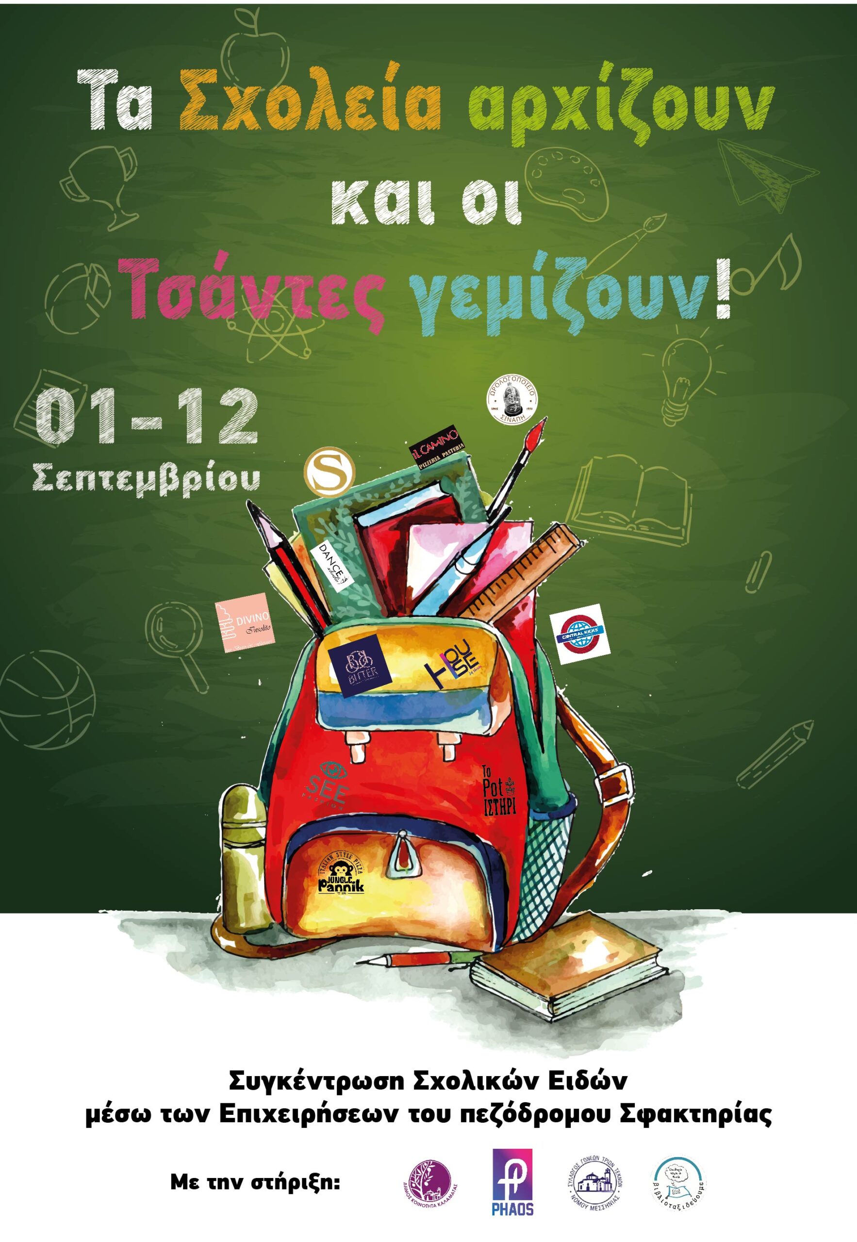 Με αφορμή την έναρξη της σχολικής χρονιάς, οι επιχειρήσεις που εδρεύουν στον πεζόδρομο της οδού Σφακτηρίας στην Καλαμάτα, συγκεντρώνουν σχολικά είδη από 01 έως 12 Σεπτεμβρίου, προκειμένου να τα διανείμουν σε δομές και οικογένειες της πόλης που χρειάζονται τη στήριξή μας.